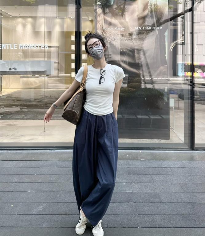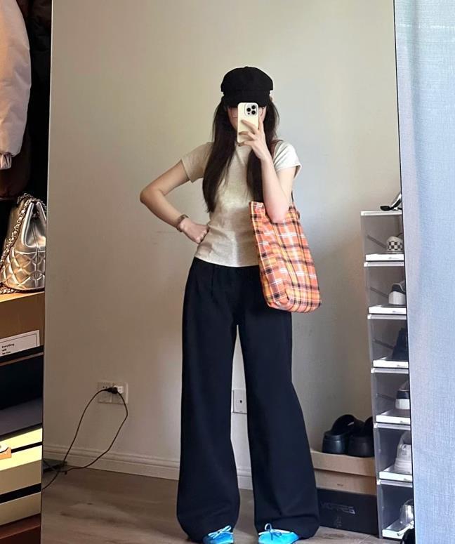 很適合小個子女生的穿搭,上短下長的組合,不僅優化了整個身材比例,還能拉長腿部線條,在視覺上也能打造出高挑感。黑色短袖t恤+白色闊腿褲+平底鞋,梨形身材也可以輕鬆hold住,顯瘦效果太好了。