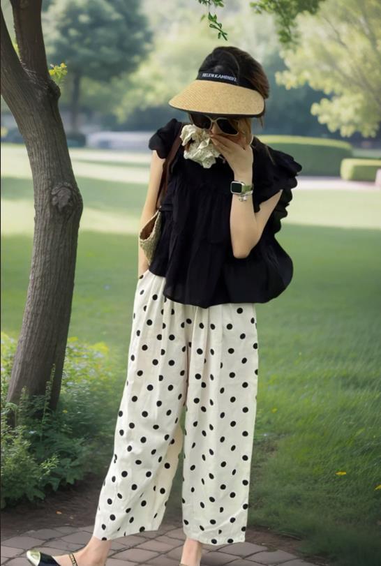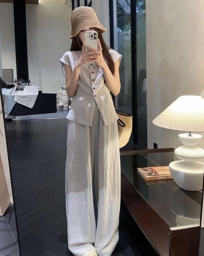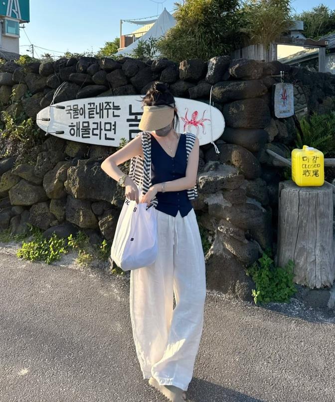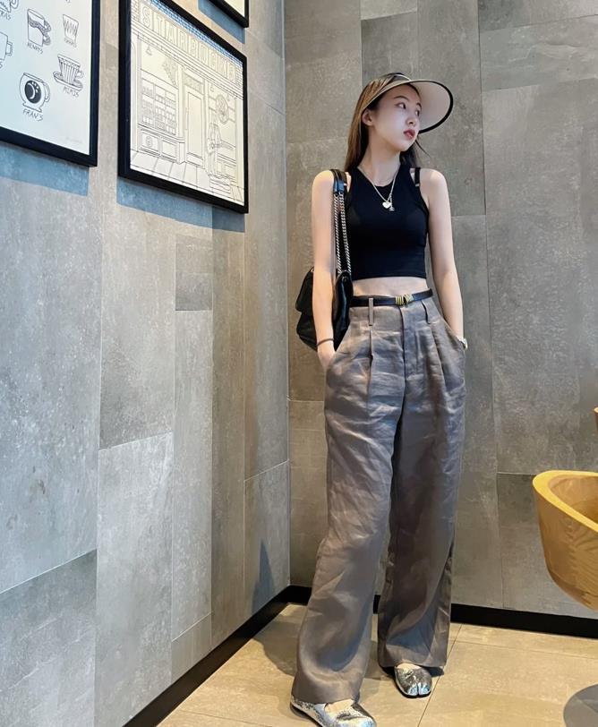 誰能不愛這種姐姐風的搭配呢,黑色緊身背心+棉麻闊腿褲,這種褲子面料透氣性可是極佳的,寬鬆的褲型,實在是太顯瘦了,適合腿粗的身材們。上緊下松的搭配,不僅優化整個身材比例,還顯瘦顯腿長。