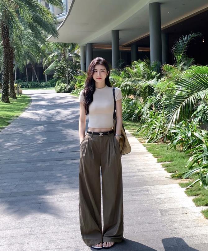 短款t恤+休閒闊腿褲,上短下長的搭配,對身材進行了很好的優化作用,這麼穿實在是太顯瘦了,西裝款式的褲子,質感和版型都很不錯,上班通勤,或者是出門逛街度假都可以這麼穿。