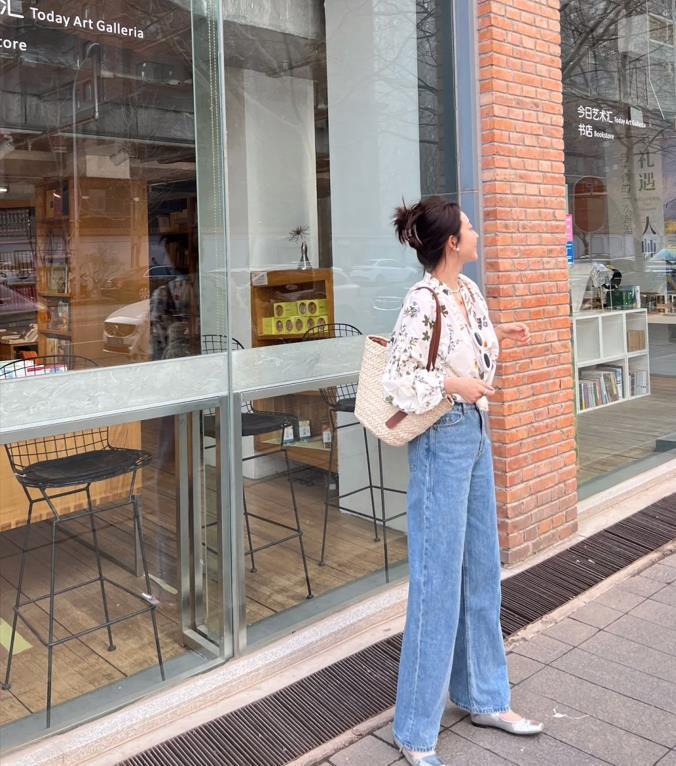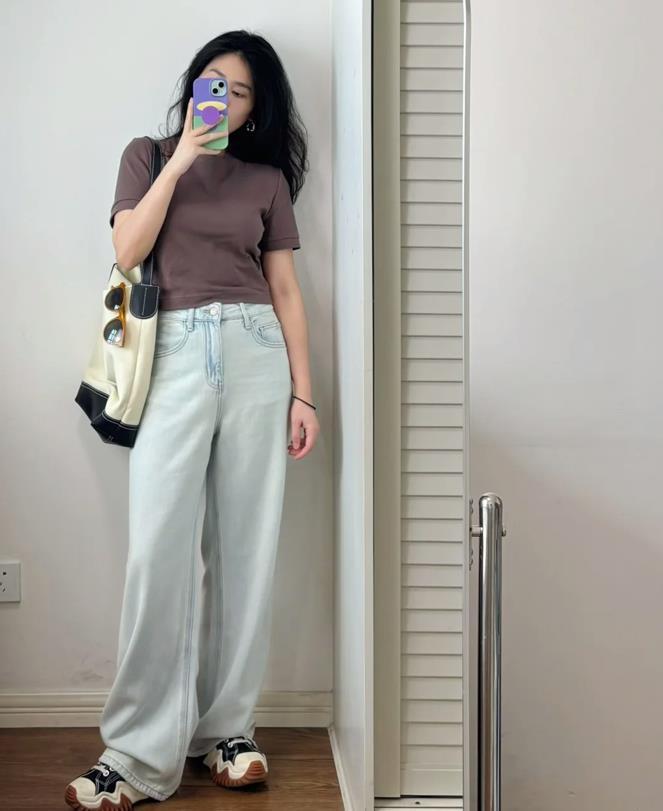 簡單修身的短t+淺色闊腿牛仔褲,鞋子配的是一雙運動鞋,這種搭配看起來簡單又舒適,水洗牛仔藍色的闊腿褲,自帶清爽氣息,很乾淨又百搭,寬鬆的褲筒,什麼腿型都能hold住。