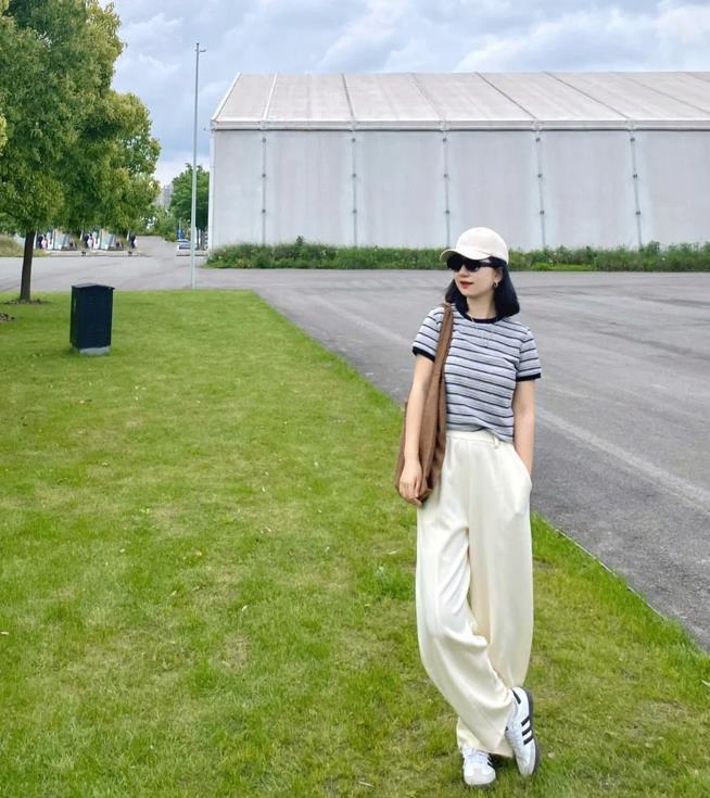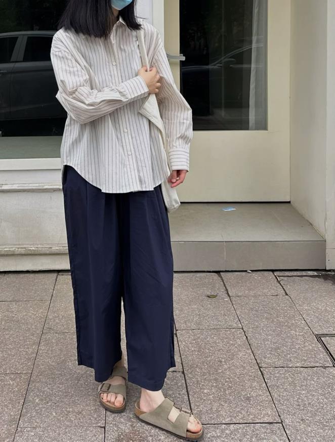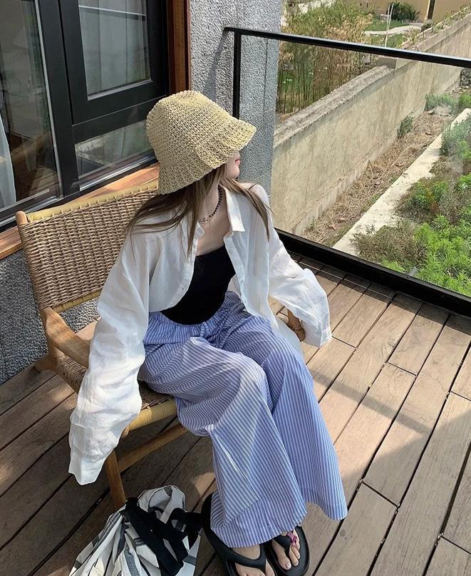 夏天的穿搭,除了要簡單一些之外,還要穿得鬆弛一點,寬鬆版型的襯衫和闊腿褲,這麼一套組合在一起,實在是太顯瘦和藏肉了。條紋款式的襯衫,比起純色款時髦太多了,在視覺上可以給人一種很瘦身的效果。出門隨便踩着一雙涼拖鞋,又多了幾分隨性。