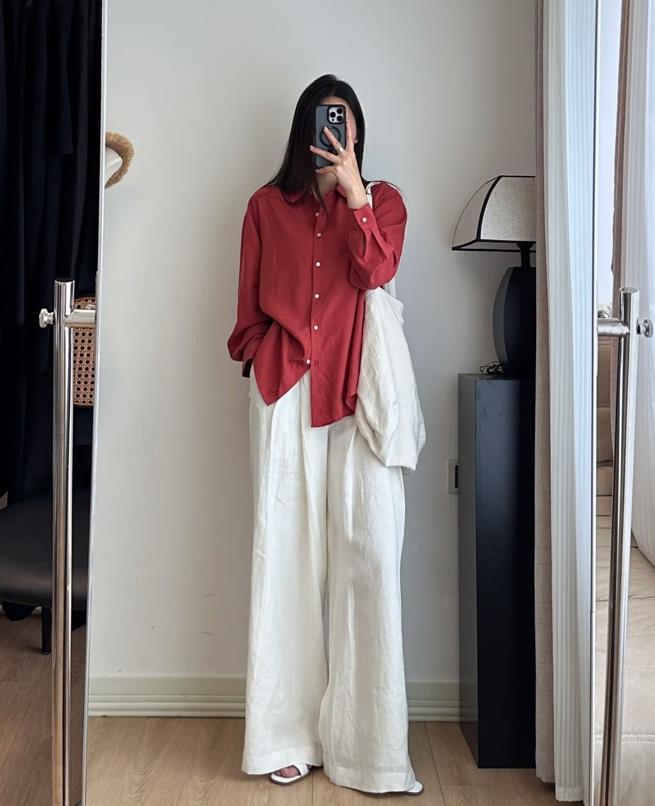 上松下松的搭配,看起來真的太隨性自在了,亮眼的復古紅襯衫+白色亞麻闊腿褲,再加上一雙平底涼鞋,鬆弛感滿滿,這麼穿太舒適自在了,最重要的是顯瘦。