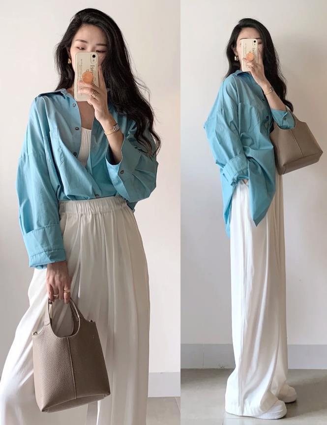 有種清冷感氣息的穿搭,簡約又不失氣質,淺藍色襯衫,真的太適合在夏天穿了,很襯膚色和顯吧,單穿或者是與個性小背心進行疊穿,都是非常不錯的。搭配起一條淺色闊腿褲和平底鞋,隨性自在又好看。