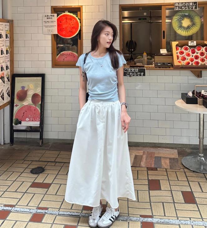 藍白配色實在是太適合夏天穿了,乾淨清爽,這樣的顏色搭配,沒有誰會拒絕的,有些修身的短袖t恤,下身是一條寬鬆的白色半身長裙,一緊一鬆的組合,優化身材比例,又能輕鬆隱藏起身上的贅肉,搭配一雙運動鞋,可休閒舒適了。