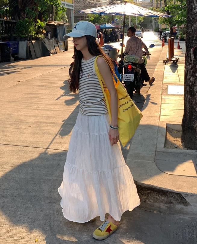 背心和半裙的搭配,就是很適合夏天的組合,乾淨又帶着幾分仙氣感的白色半身長裙,穿起來也太漂亮了,搭配條紋背心,一簡一繁的組合,輕鬆打造出層次感。腳下踩着的黃色運動鞋,和挎在身上的包包進行了呼應,讓整個造型配色更協調了。