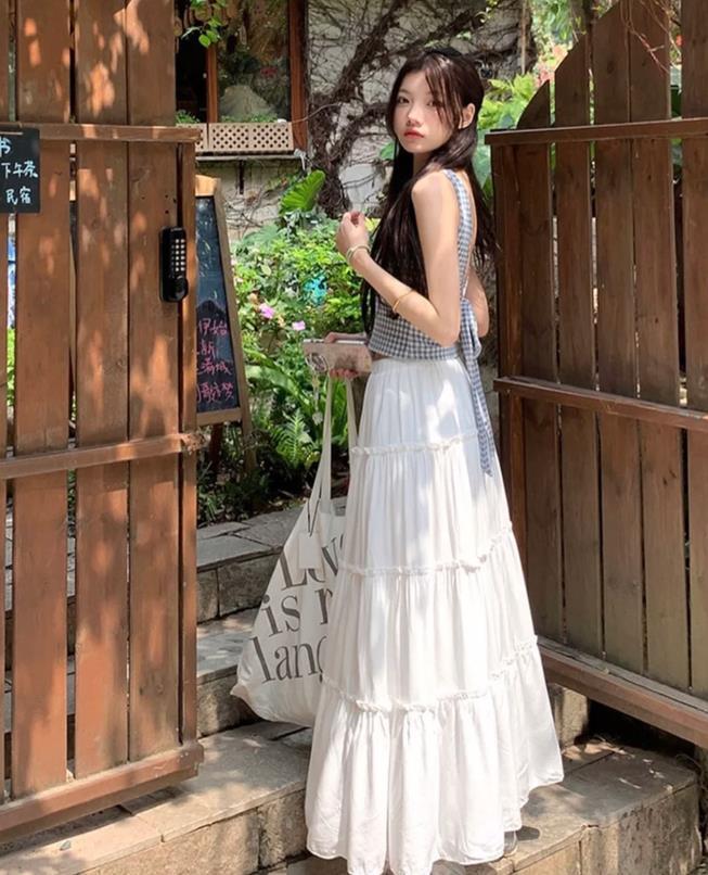 夏日充滿小清新的搭配,看起來也太清爽涼快了,藍白格子無袖背心,自帶清新又不失俏皮,搭配白色半身長裙,這種純潔的白色,讓整個人看起來很溫柔,這麼一整套看起來既時尚又充滿活力。