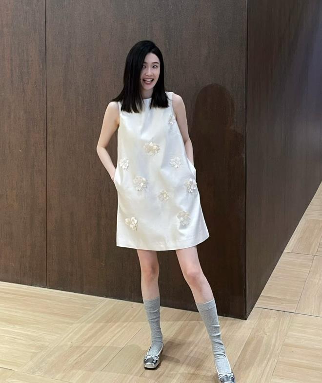 這款珍珠無袖連衣裙,細節感十足,寬鬆的裙身,能輕鬆修飾整個身材比例,最重要的是非常顯瘦。搭配一雙中筒襪子,很好爲整個穿搭增加了層次感,腳下踩着一雙銀色瑪麗珍單鞋,也太溫柔氣質了。