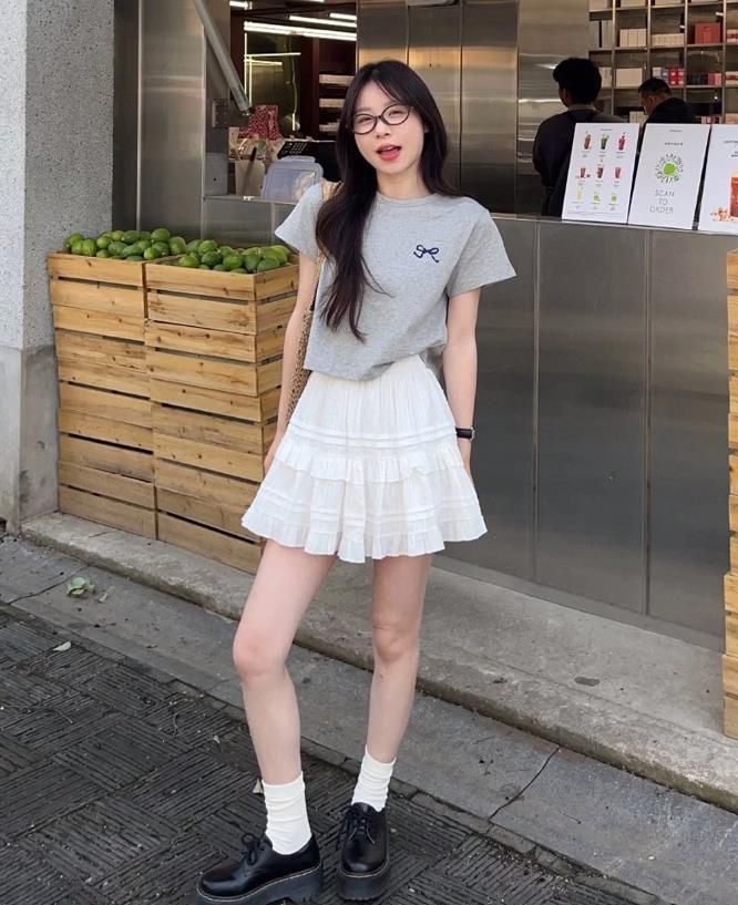 短款t恤+白色半身短裙,很適合小個子女生的穿搭,150也能穿出160的既視感,整體看起來就非常顯高挑,還減齡顯嫩。穿上一雙白色襪子,對整個造型都進行了點綴,也增加了穿搭的層次感。