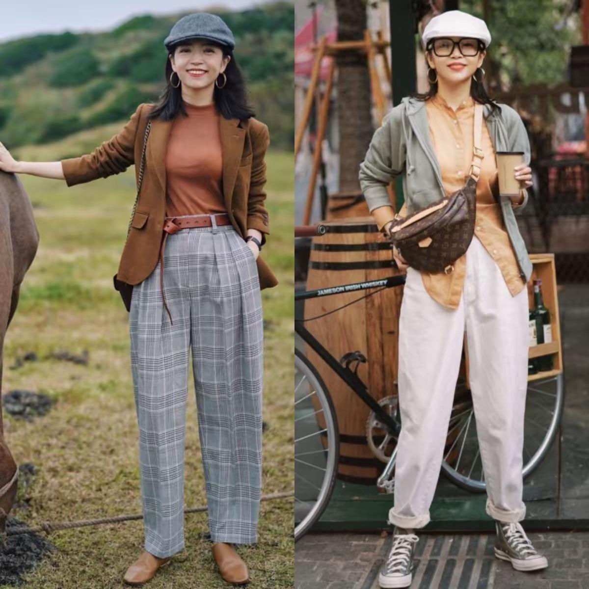 修身的棕色打底衫、灰白格紋的復古風西褲,收腰的棕色西服外套、大耳環、畫家帽,整體素雅低調、文藝內斂。每一件單品之間、色彩契合度都很協調。