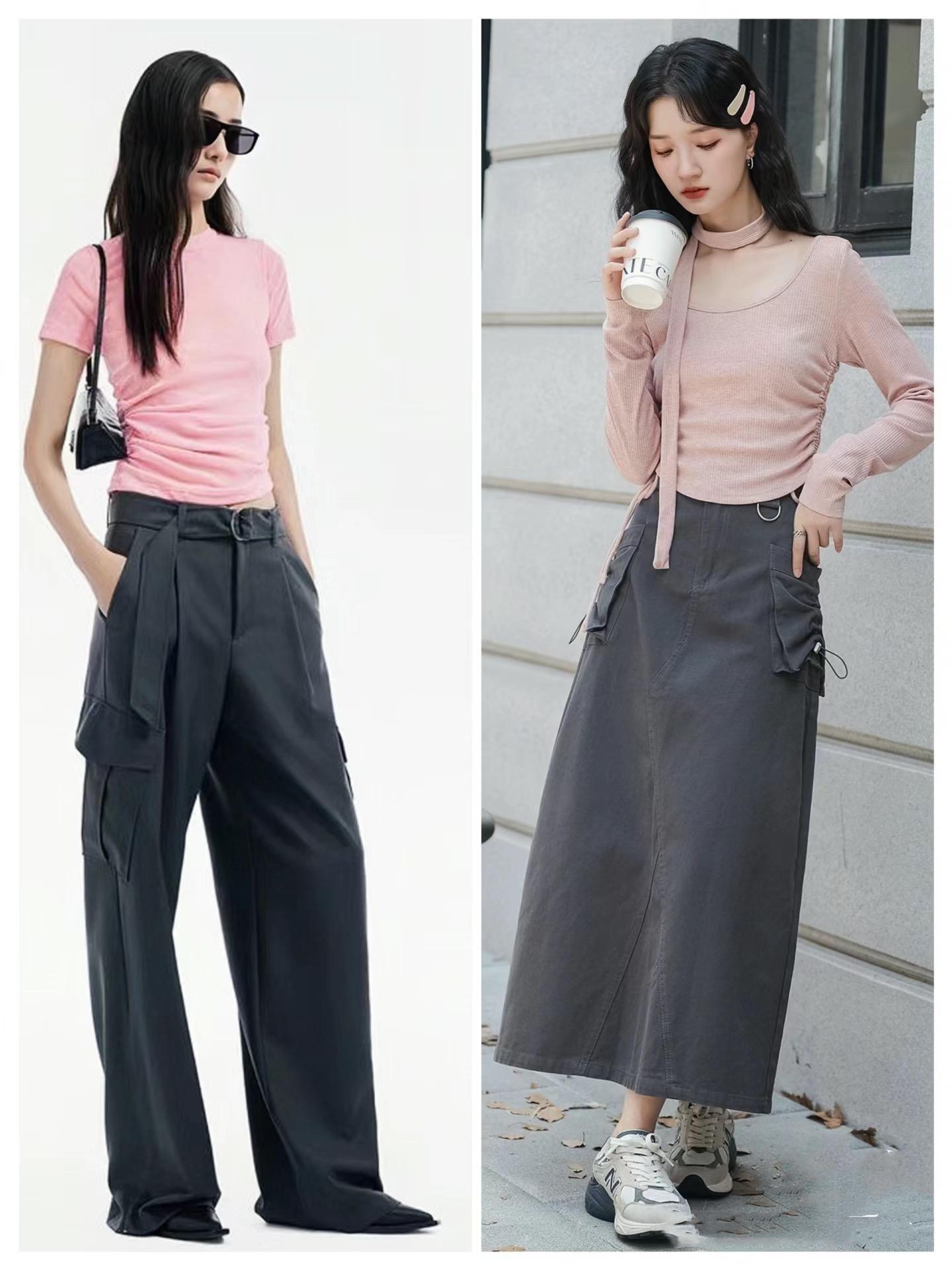 淺粉色的T恤,屬於一種更柔和的色調。我們可以用來搭配灰色系的闊腿褲、或者A字形半身裙。粉色T恤腰腹部立體的捏褶收腰,視覺上顯瘦效果也更強。