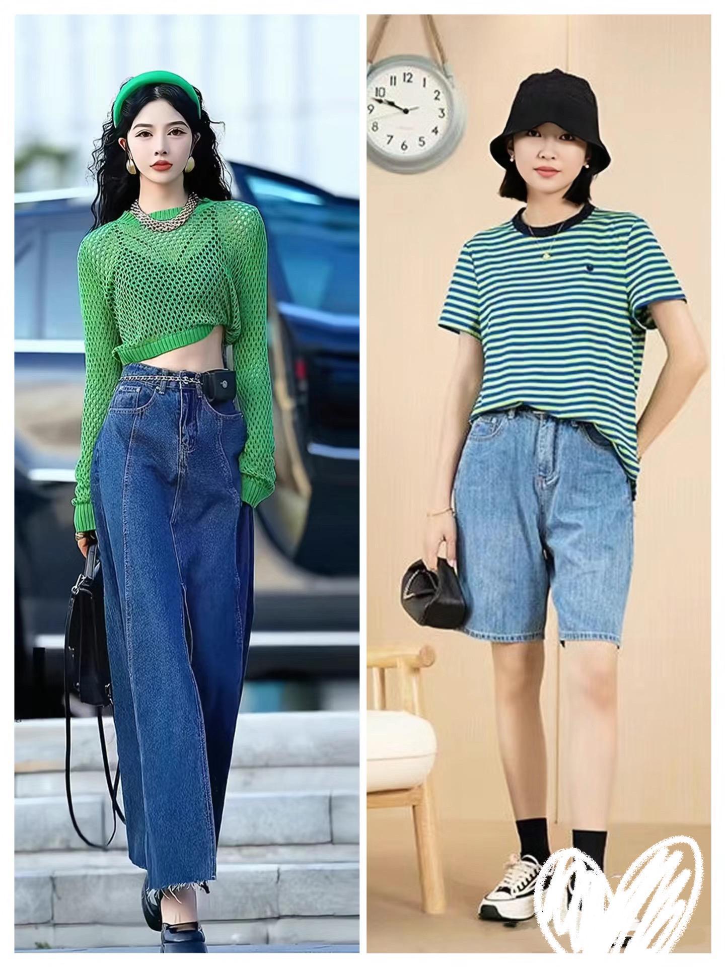 深綠色漁網上衣,搭配深藍色牛仔褲,高亮度的色彩有一種大方醒目的美。這種高亮度+高飽和度的配色,提氣場又顯白。深藍色牛仔褲,多片立體剪裁、更加洋氣顯廋。