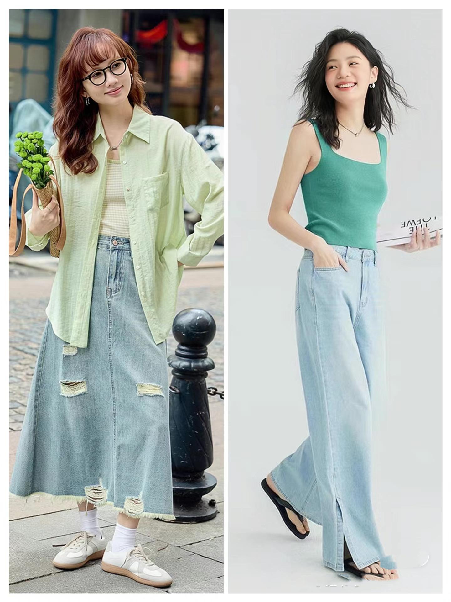 用淺綠色襯衫,搭配淺藍色的牛仔半身裙。同屬於淺色系的組合,整體風格也會更加溫柔一些。內搭也是綠白條紋的小背心、整體風格簡約清爽、透着小女生的嬌嫩。