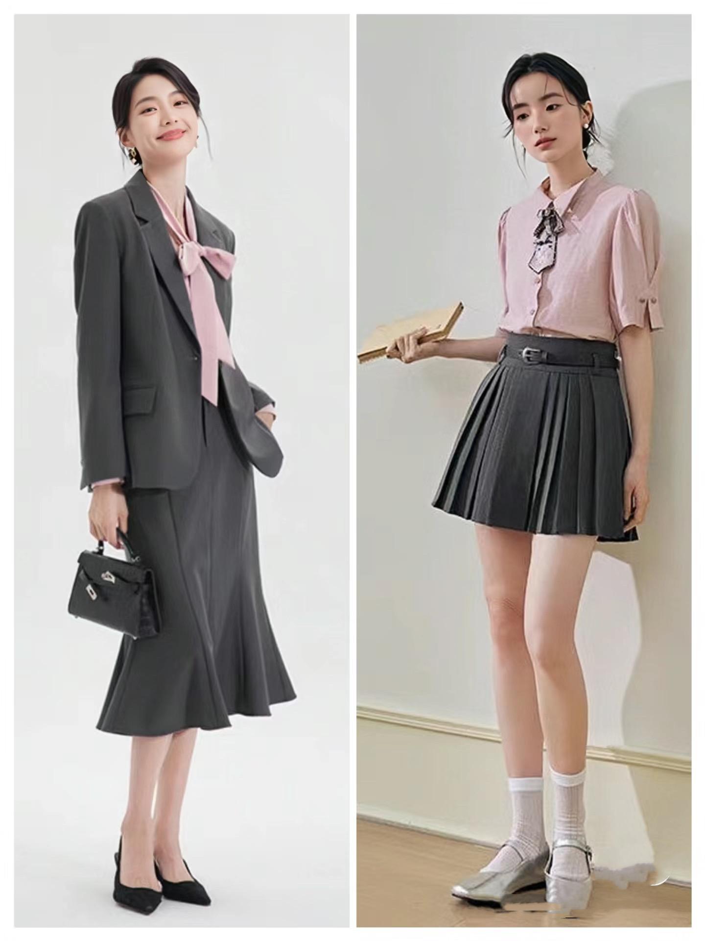 比如干枯玫瑰粉的襯衫,可以配灰色百褶裙、也可以配灰色西服套裙。簡約又不單調,粉色系襯衫系領結、或者搭配飄帶元素,都更耐看。