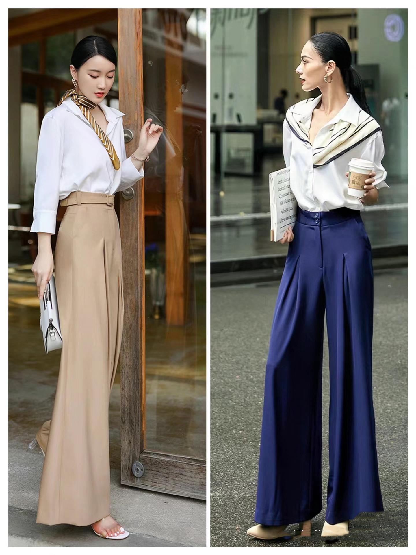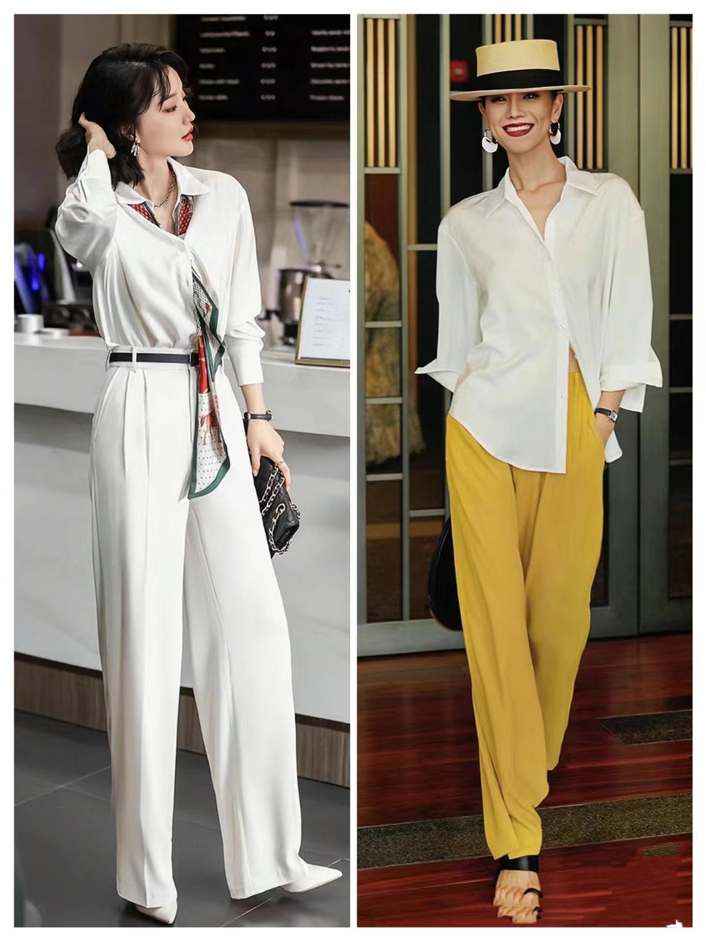 白襯衫+白色西裝褲、或者白襯衫+黃色闊腿褲,都是非常醒目又高級的穿搭。