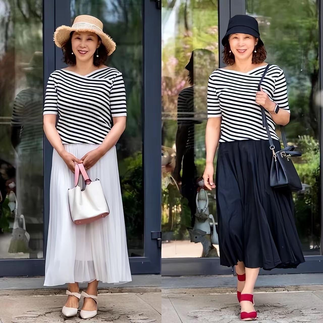 領口偏大一點,但不建議選擇橫開領。因爲橫開領會顯得肩寬,密集的條紋T恤配純色系的半身裙,也是體面大方。