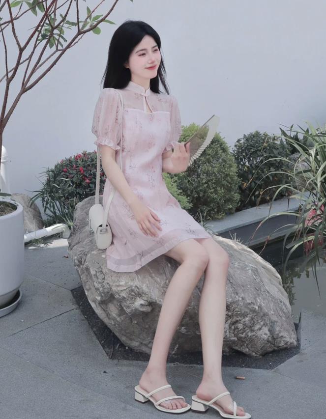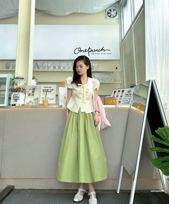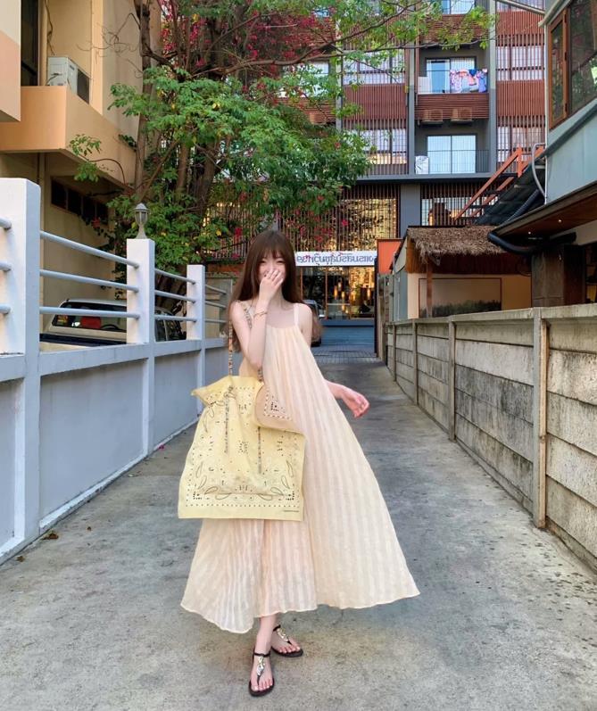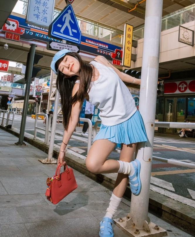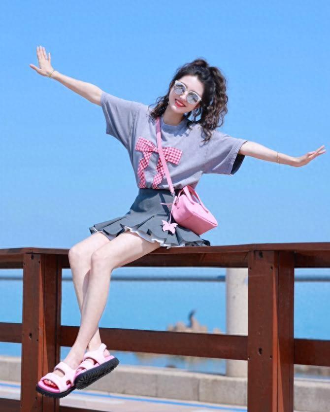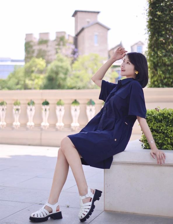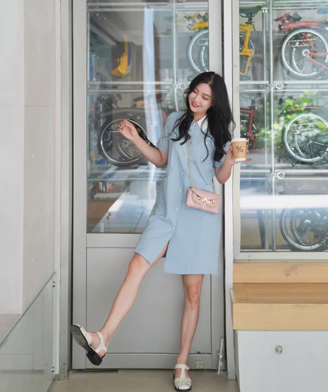 粉藍白的搭配,真的太適合夏天了,視覺上降溫效果太好了,搭配米白色羅馬涼鞋,這樣的穿搭,給人一種很輕鬆自在,又舒適的感覺,白色羅馬涼鞋,與裙子上白色翻領進行了呼應,增加了和諧度。