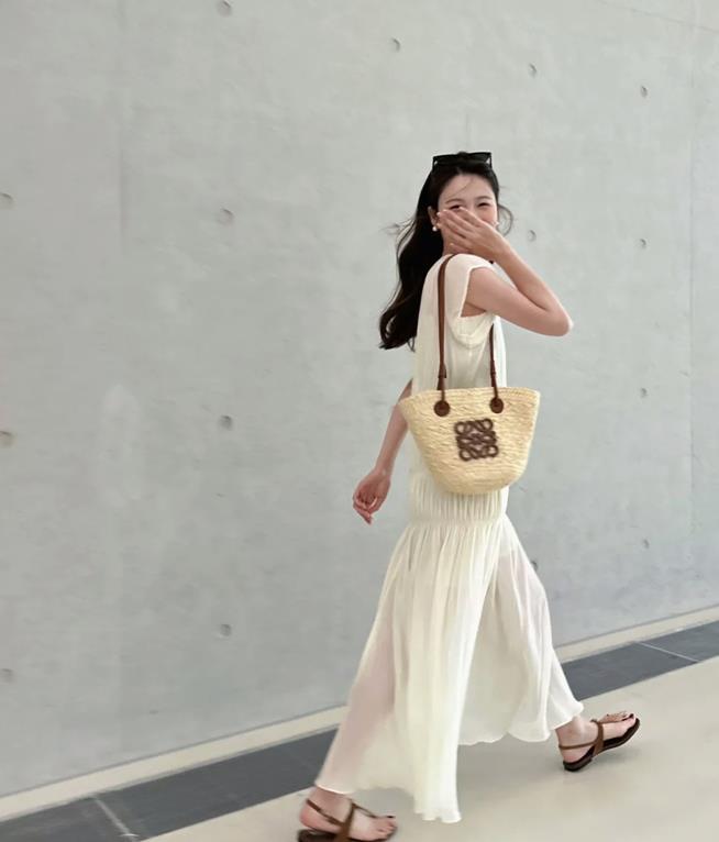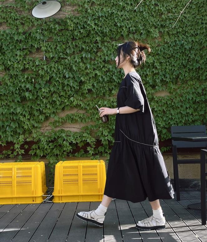 黑色的連衣裙,真的是很百搭呢,在視覺上也能給人一種很瘦身的既視感,加上寬鬆的版型,可藏肉顯瘦了。裙子長度到小腿爲止,既可以在視覺上拉長腿部線條,又能遮掩起腿部的缺點,搭配上一雙羅馬涼鞋,鬆弛感十足。
