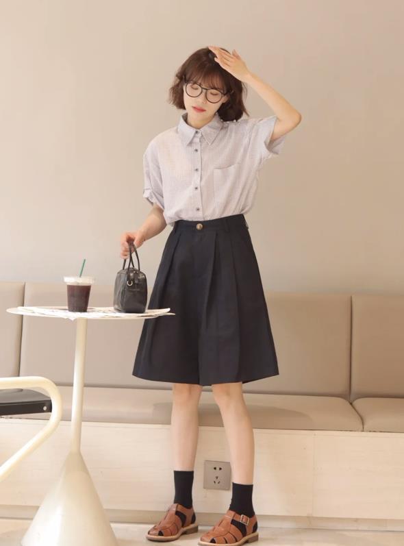 喜歡復古風?喜歡文藝範?沒有關係,這一身穿搭都可以滿足你,藏藍色五分短褲+咖色羅馬涼鞋,上衣是一件格紋襯衫,有些小俏皮又不失文藝復古風。