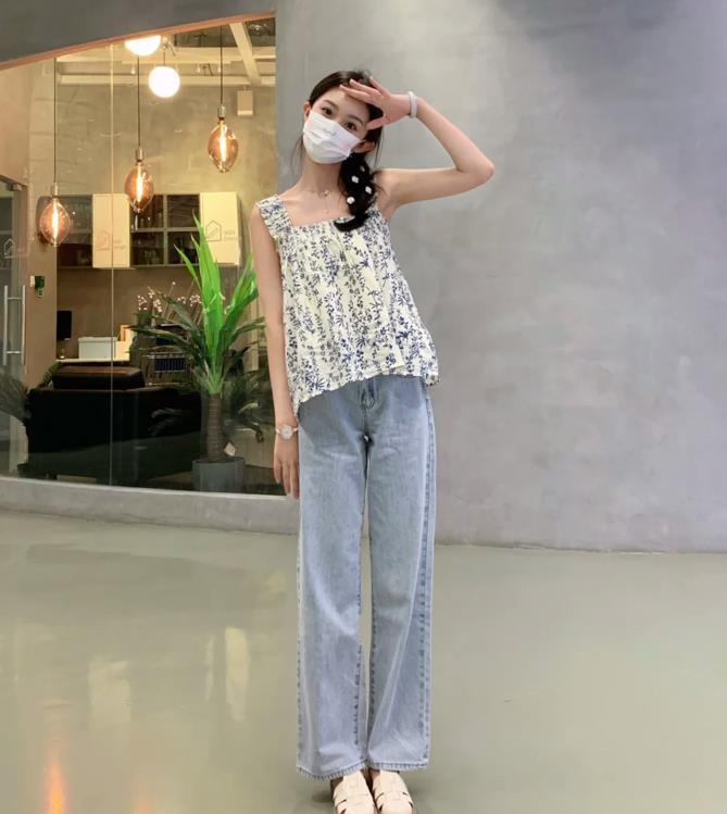 這一套穿搭也太適合夏天了,一整個小清新少女範,碎花小吊帶+淺色牛仔直筒褲,再加上一雙白色羅馬涼鞋,奶白色真的特別百搭,也耐看。不想露出腳趾的姐妹就可以試試,休閒舒適又涼快的一身。