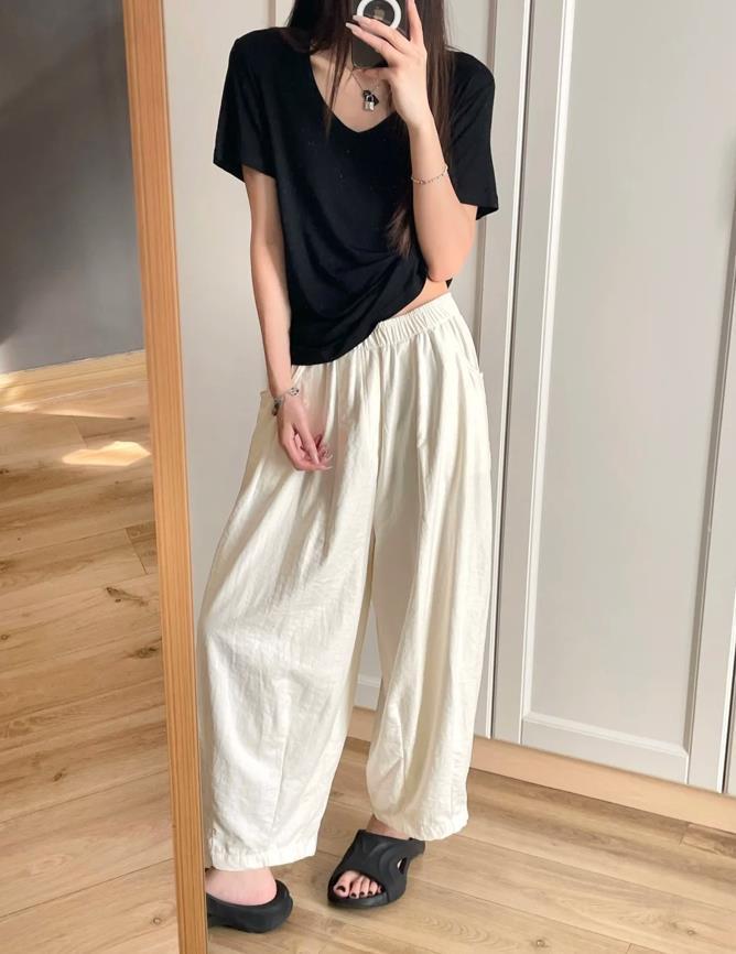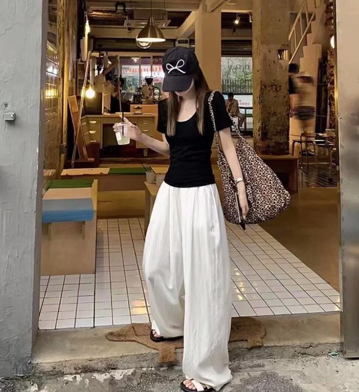 一條白褲子,就可以讓你輕鬆度過整個夏日,寬鬆的白褲子,也太藏肉顯瘦了,亞麻材質的面料,很透氣和舒適。搭配一件黑色修身短袖t恤,一緊一鬆的組合,真的太優化身材比例了,出門隨便一雙涼拖鞋,隨性又自在。