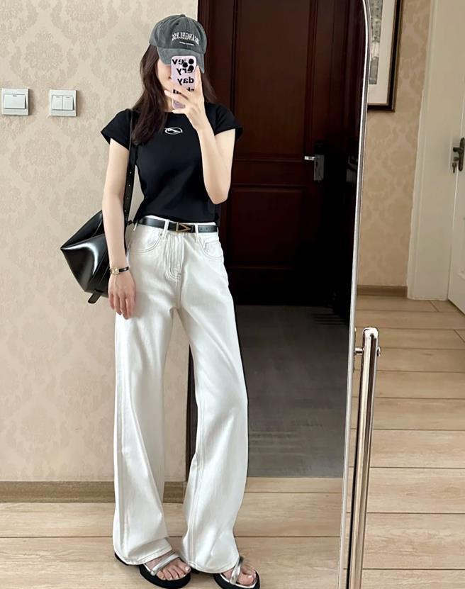 黑白配的穿搭,就是時髦和耐看呢,這麼一整套看起來就非常顯高級,黑色正肩短袖T恤,修飾身材比例,又好搭配。選擇一條白色牛仔直筒褲來配,這種褲子穿起來也太顯瘦了,利用腰帶進行點綴,既強調了腰身比例,又瘦身。