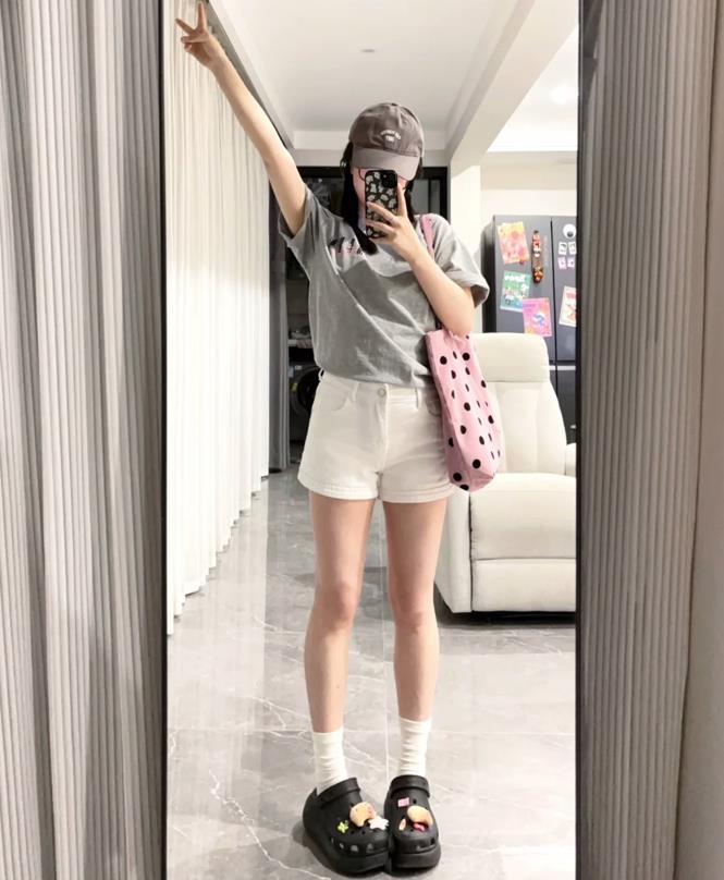夏天就是要簡簡單單纔好看啊,灰色短袖t恤+白色牛仔短褲+洞洞鞋,出門逛街或者是度假這樣穿真心不錯。腿部比例好的身材,就一定要選擇這種穿搭,不僅清爽涼快,還很顯腿長,白色襪子的加入,增加層次又不失時髦。