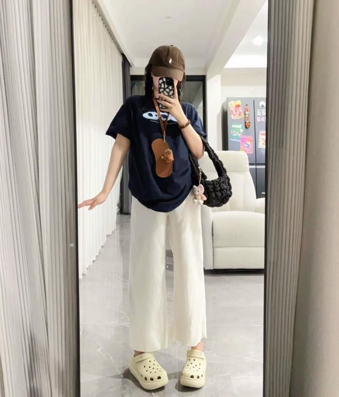 簡單舒適的穿搭,實在是太適合夏天了,藏藍色的短袖t想+白色九分褲,這麼穿也太好看和休閒了。九分長度的褲子,能輕鬆拉長腿部線條,對於個矮的身材來說,也是非常友好的,加上寬鬆的褲型,更藏肉顯瘦了。