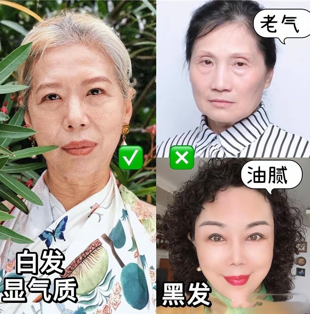 原生黑色是一種更輕盈的透氣感,染過的黑髮就顯得厚重、色彩非常重。這種老氣的黑髮,反而會映襯出更老氣油膩的效果,倒不如自然的白髮更顯氣質。