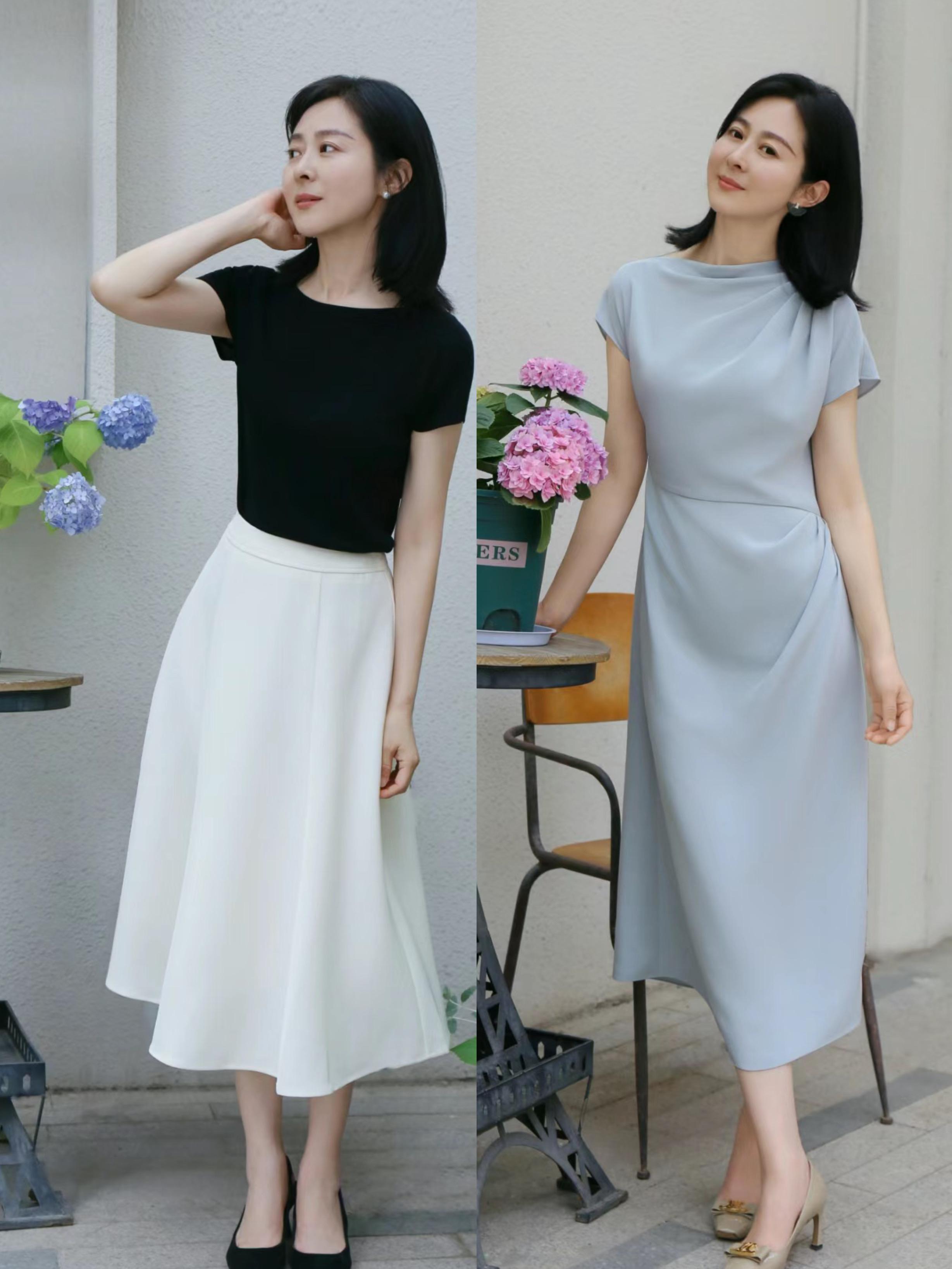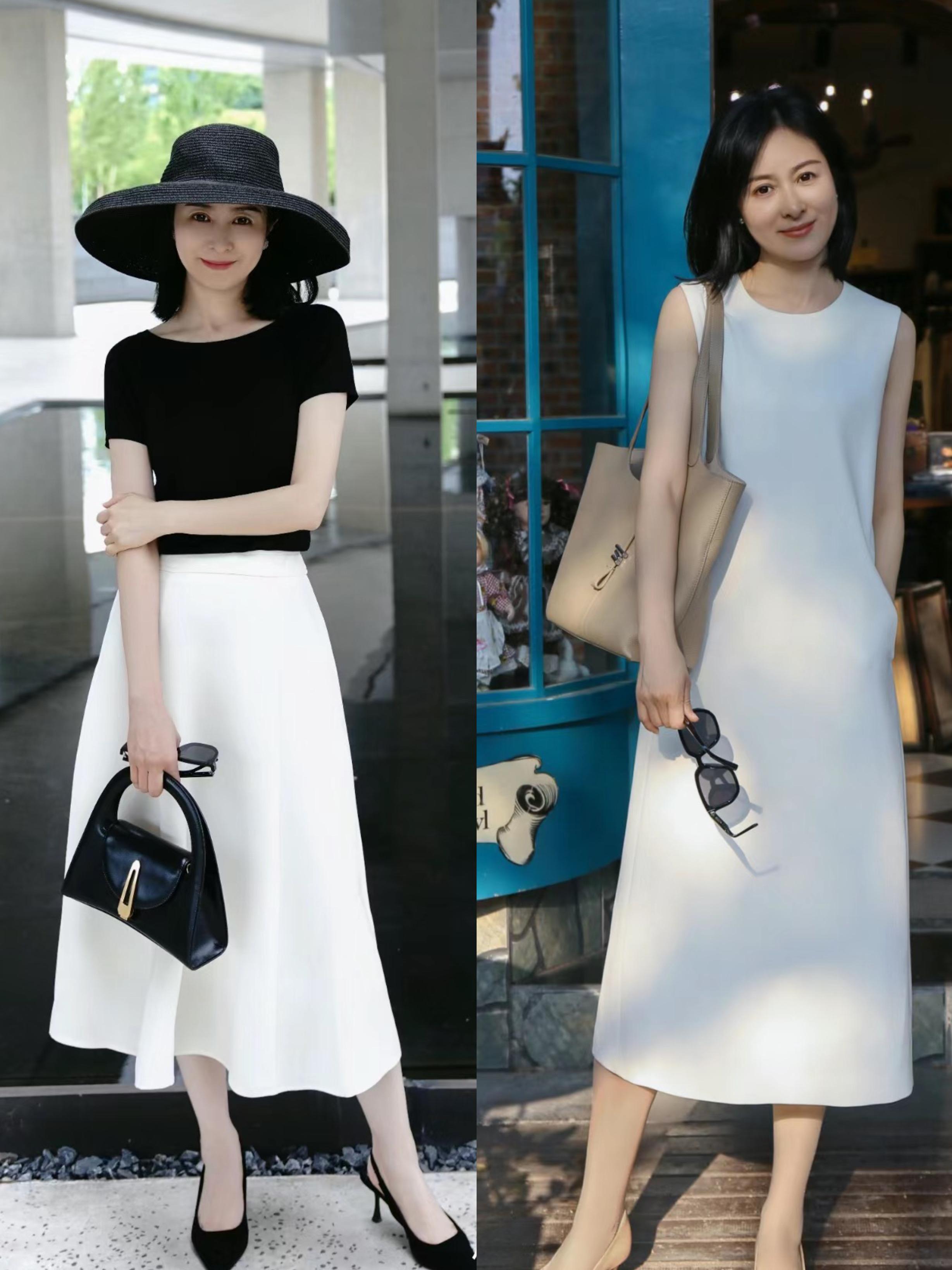 經典的黑白配、怎麼穿都不會過時。修身的黑色T恤,與面料垂順的白色半身裙,搭配在一起簡約高級。日常、通勤穿着都很大方顯貴。