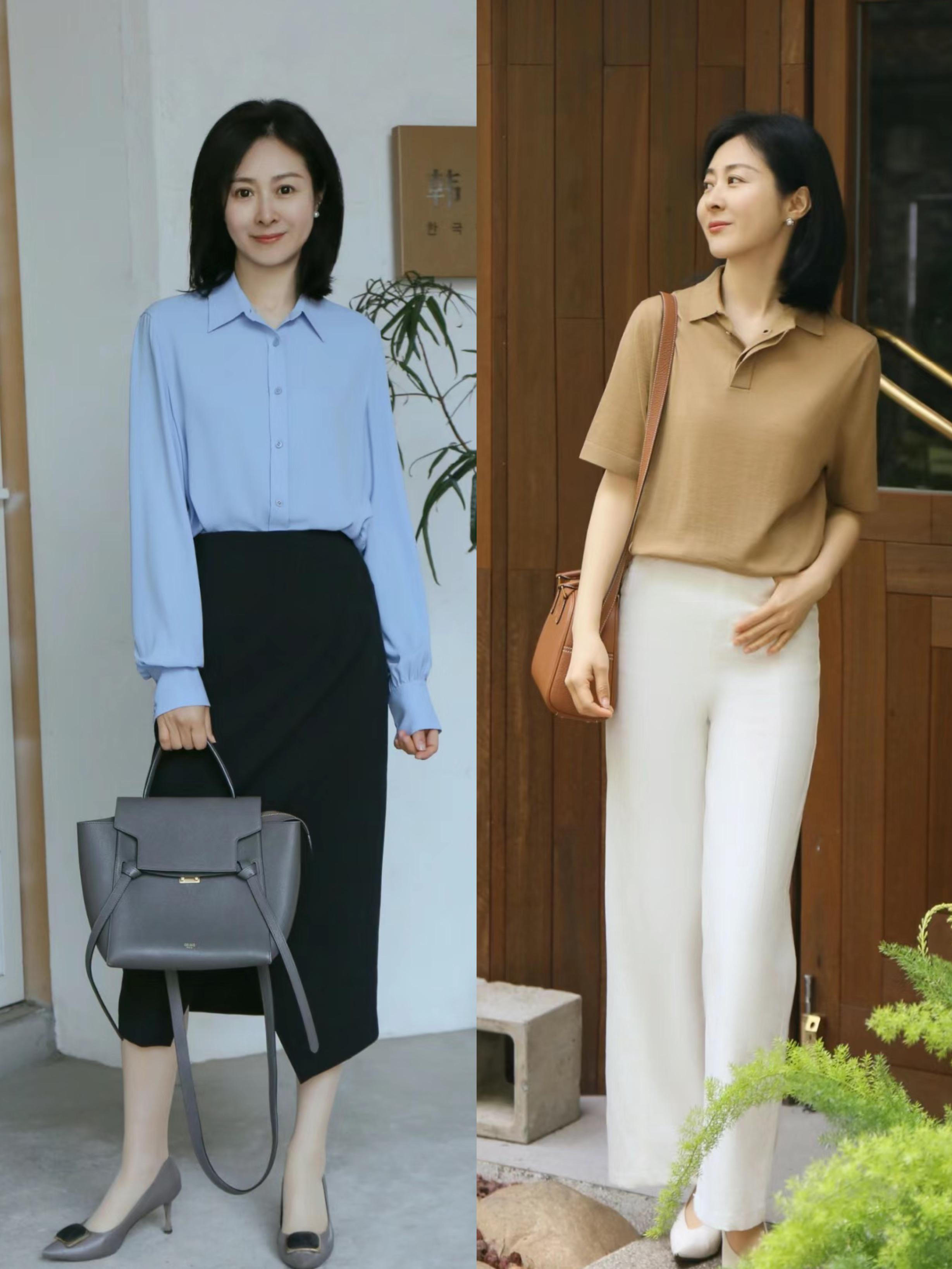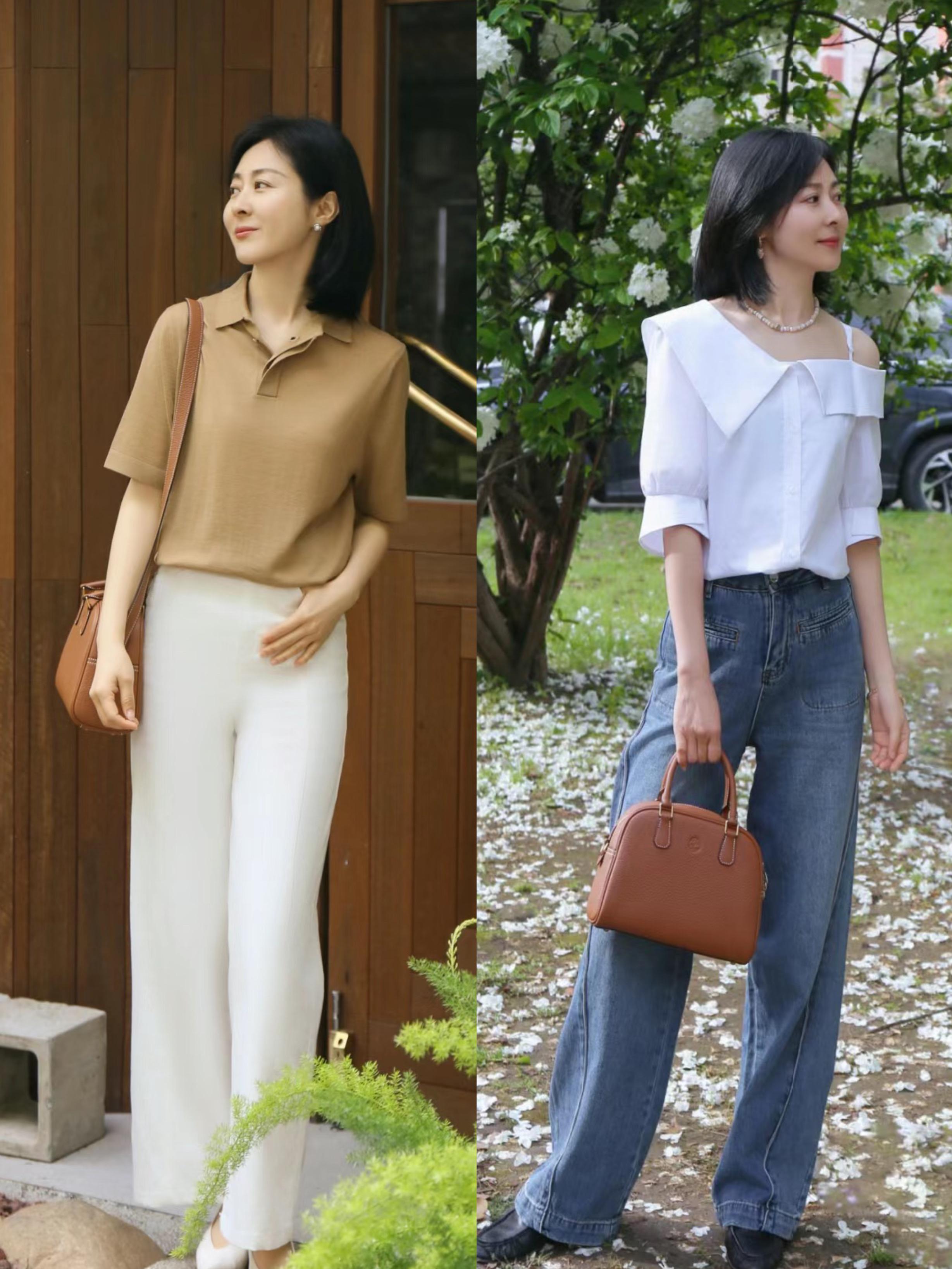人到中年,依然可以嘗試帶有小個性的穿着方式。比如清爽又顯白的襯衫,可以選擇露肩的款式。