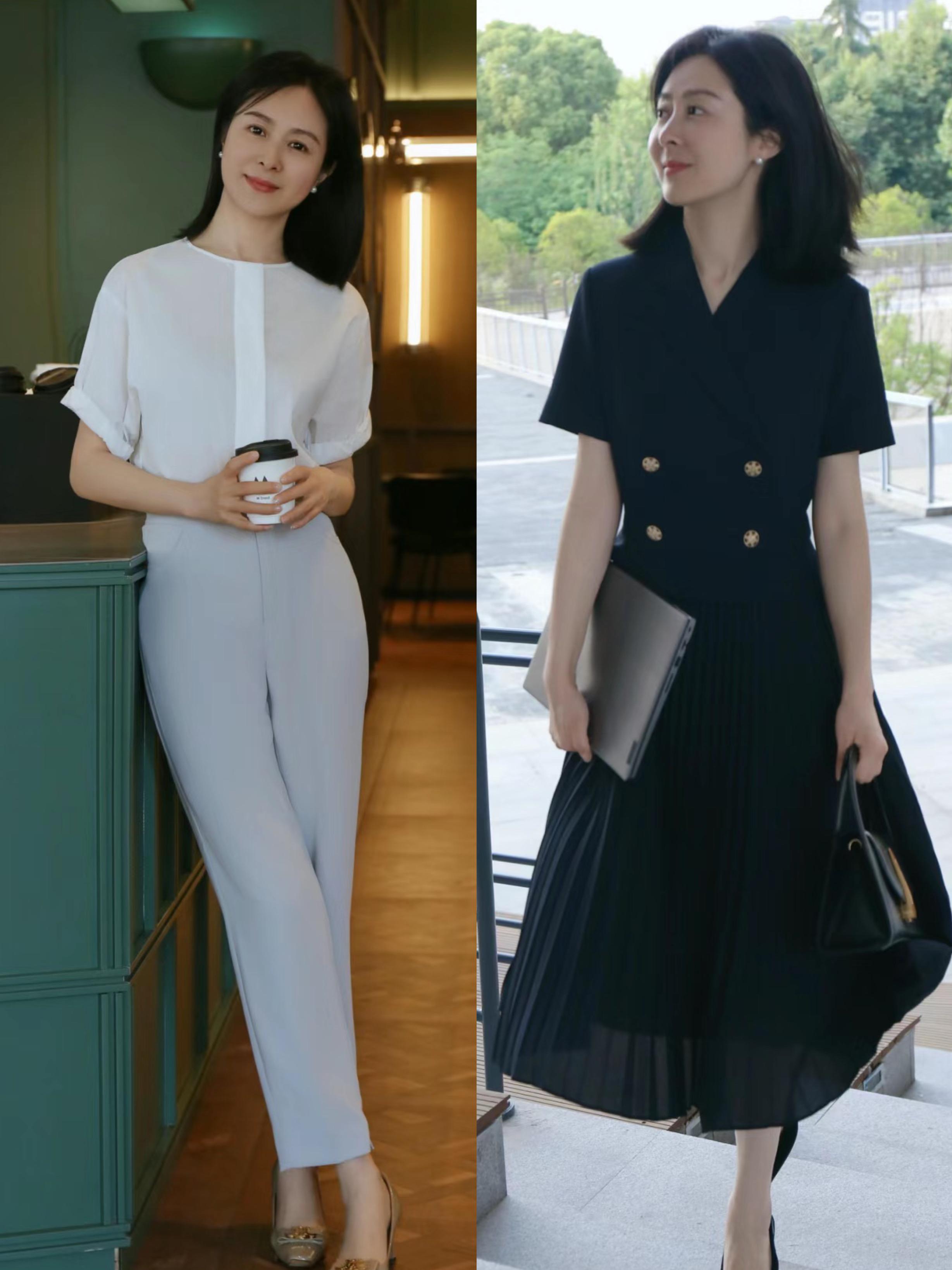 上班通勤、或者主持商務會議,都應該穿得更加利落體面一點。修身的西裝連衣裙,雙排扣的款式、也是大方耐看。