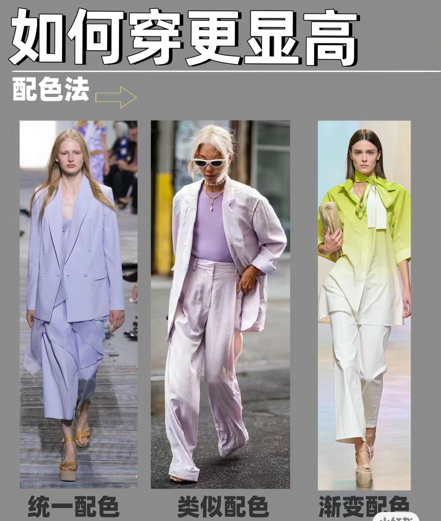 統一配色的縱向延伸,臨近配色的雅緻協調、漸變配色的自然過渡,都是比較顯高的配色方式。小個子不要選擇割裂性太強的配色,容易影響比例的劃分。