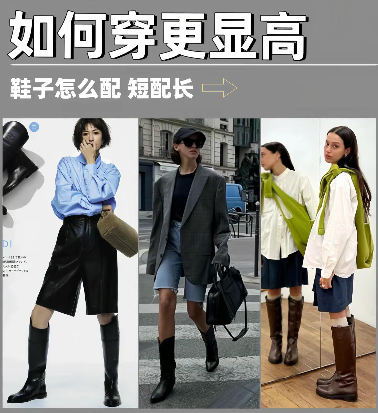 下裝與鞋子的對比,不僅顯的小腿更加纖細、也會更爲顯高。選擇長筒靴,儘量包裹小腿線條,不然會顯得小腿粗壯。
