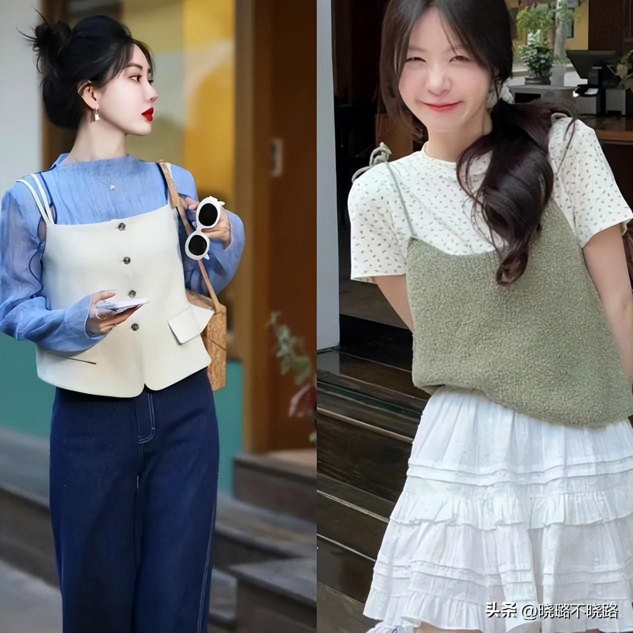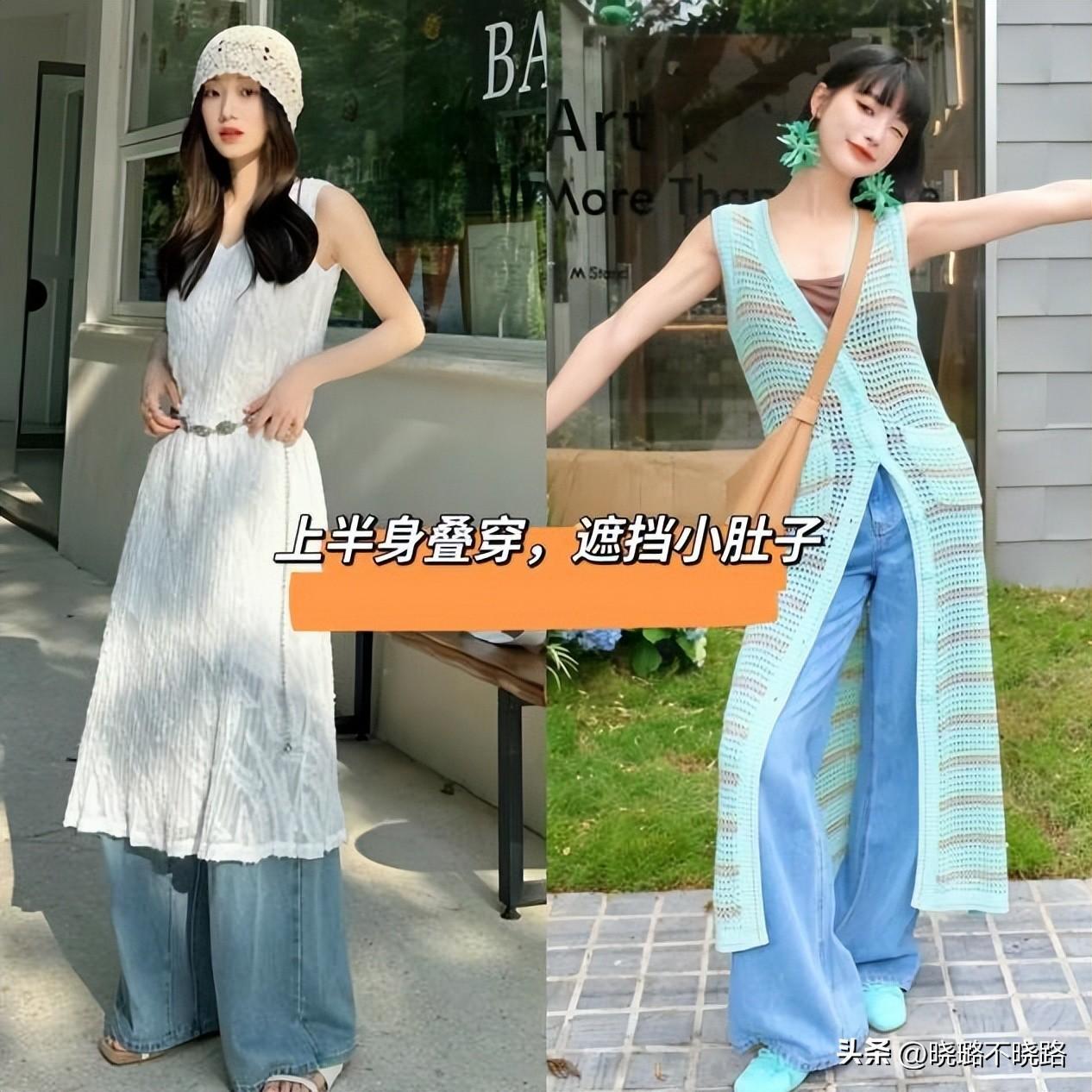 大家也可以通過疊穿的方式來隱藏小肚子,但是一定要注意選擇寬鬆一些的外套疊加修身的內搭,這樣可以藉助於外寬內窄的組合來顯高顯瘦,比如開衫配露臍背心,防曬衫配短袖等等。