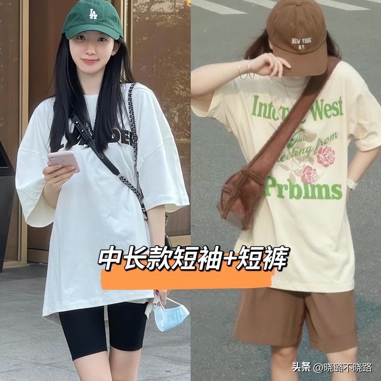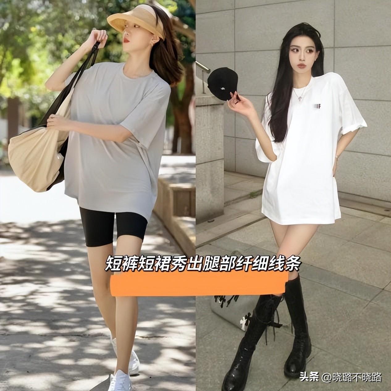 上半身稍微長一些可以更好地遮擋肉肉,而下半身短一些能夠更好地製造出輕盈與幹練感。尤其對於腿型比較優秀的女人來說,長款T恤配短裙短褲,可以更好地秀出身材優勢。
