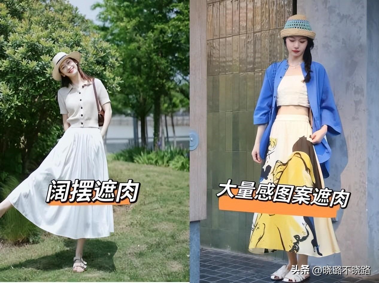 相比於修身的褲裝來說,裙子的包容性更強,更能夠隱藏住小肚子。因此有肚子的女人,可以嘗試一下高腰傘裙配寬鬆上衣,在闊擺的襯托之下,輕鬆的隱藏起腰腹和大腿的贅肉。