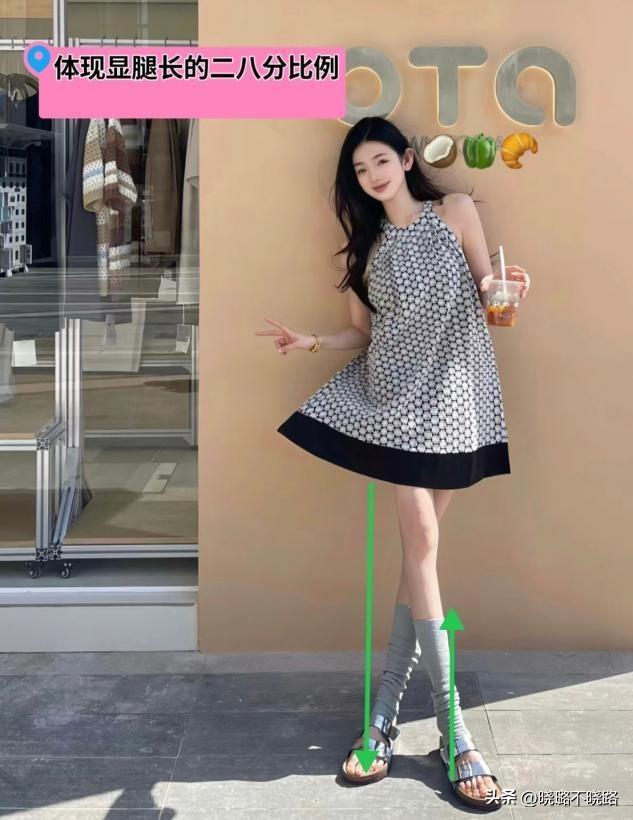 如果比例的狀態沒有那麼具有優勢或者是本身腿型比較短一些的話,那麼在選擇裙裝系列的時候,還是要與短款的裙裝結合起來是最爲適宜的,例如短裙的搭配剛好卡在大腿肚的位置,那麼整個下半身的二八分比例的分割感還是極爲明顯的,能夠針對整個腿型的縱向比例進行拉伸拉長的效應優化。