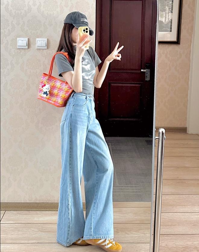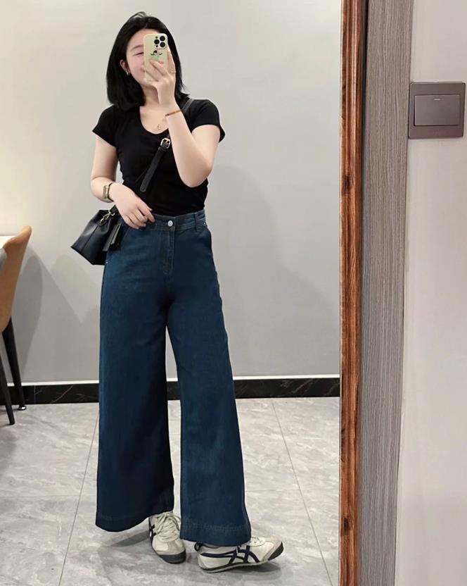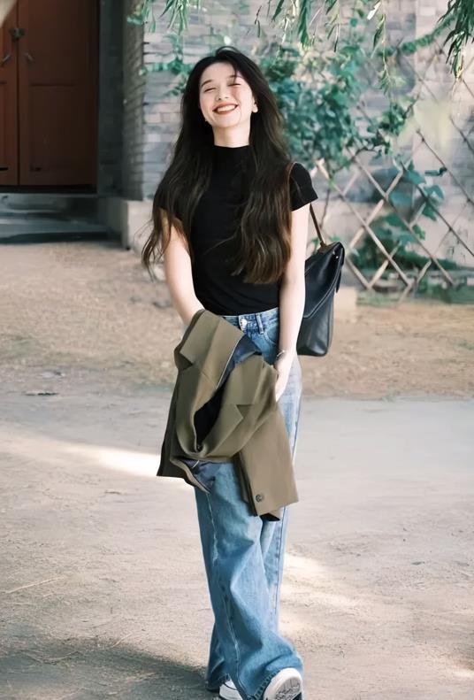 不管你相信與否,上窄下寬的搭配都是最修飾身材比例的,修身正肩短袖t+直筒闊腿牛仔褲,出門再隨便穿上一雙運動鞋,輕輕鬆鬆又好看。