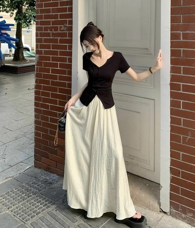 在夏天喜歡裙子的女生,一定要根據自己的身材選擇合適的款式纔行,黑色修身t恤+白色寬鬆裙子,梨形的身材這麼穿也非常顯瘦藏肉。