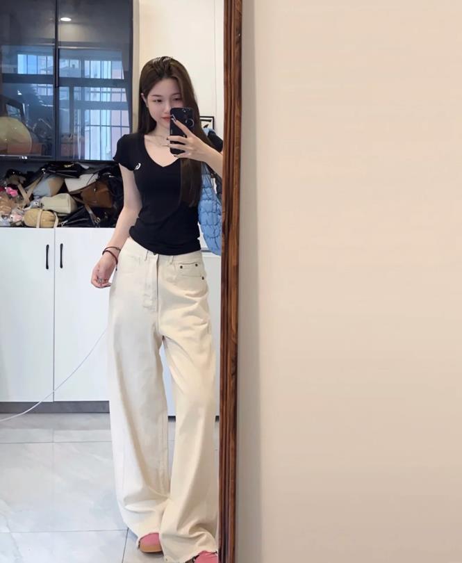 修身的黑色短袖t恤,穿起來真的可以完美勾勒出你的身材曲線和線條,本身黑色就是具有極佳瘦身效果的,加上深v領的設計,視覺上就更好拉長下身比例了。搭配起一條白色牛仔闊腿褲,上窄下寬的穿搭,我是真愛了。