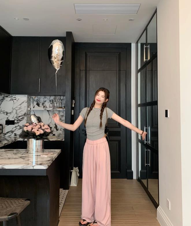 鬆弛感的穿搭,就是最適合夏天了,寬鬆一些的衣服,除了穿得舒適自在,更多的就是遮掩起身上的缺點了。灰色正肩修身短袖t恤+粉色闊腿山本褲,上窄下寬,輕鬆優化了整個身材比例,這麼穿實在是太顯瘦了。