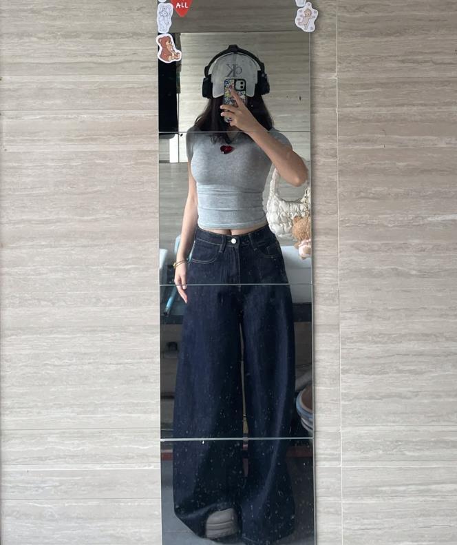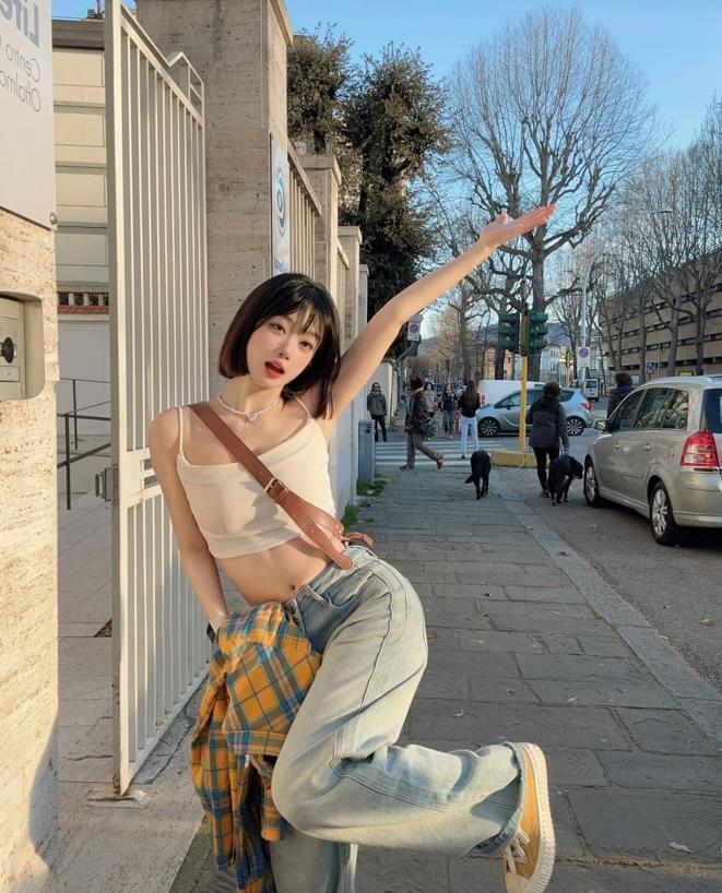 修身的吊帶+闊腿牛仔褲,短款的吊帶,將腰間的肌膚露出來,既提高了腰線比例,又能爲你的夏日注入清爽氣息。上窄下寬的搭配,最適合梨形身材了,寬鬆的褲子,輕鬆營造出鬆弛感。