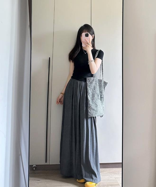 衆所周知,上窄下寬的搭配,就是上身修身,下身寬鬆,上衣選擇一些修身的t恤或者是背心,就可以很好凸顯出纖細的腰身和曲線。而下半身選擇寬鬆的褲子或裙子,像a字裙、闊腿褲,這些下裝就可以輕鬆修飾和遮掩起腿部的缺點。