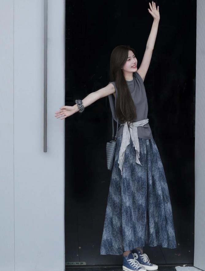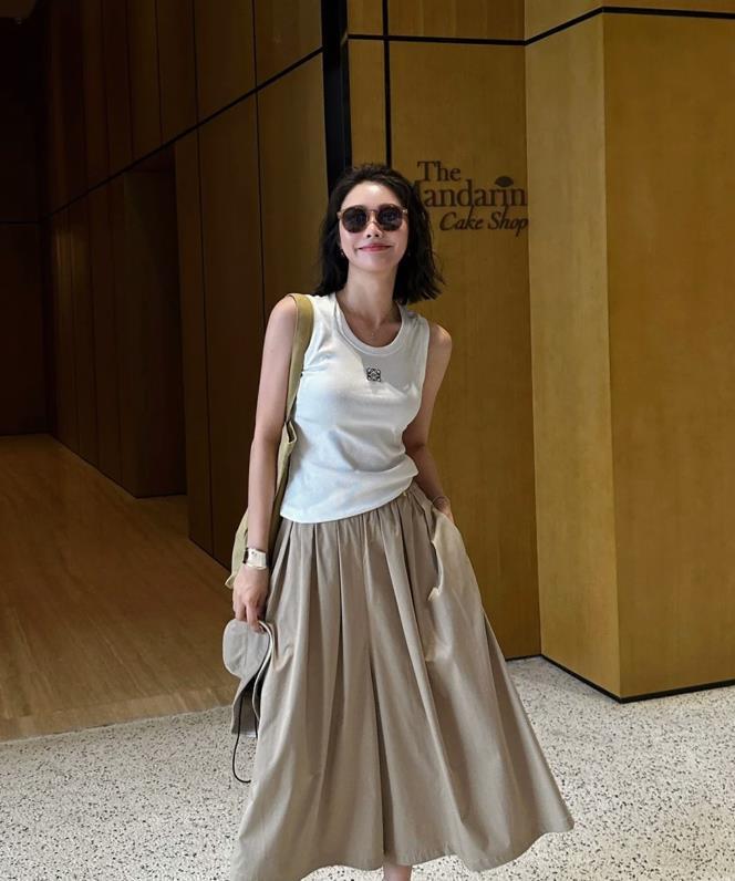 夏天的第一條裙子,就是選擇寬鬆的半身長裙吧,版型偏a字形狀,真的巨藏肉巨顯瘦,特別適合胯寬大腿粗的身材們。裙子的長度也設計得很合理,只露出纖細的小腿和腳踝,顯優雅又不經意拉長腿部線條。上衣配一件修身背心,很清爽涼快。