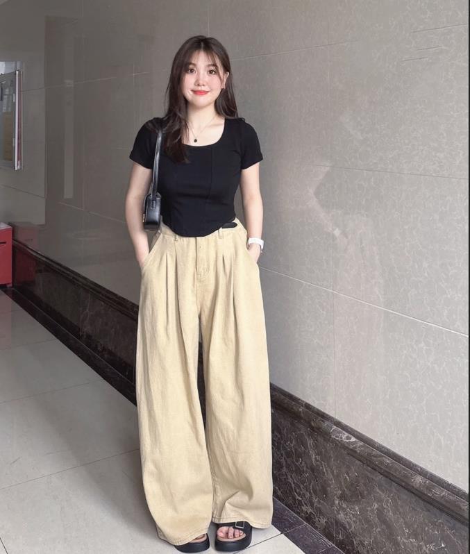 很適合微胖女生的穿搭,上窄下寬的組合,梨形身材姐妹說什麼也要好好利用起來,修身版型的黑色短袖t恤,加上寬鬆的闊腿褲,這麼一身真的巨顯瘦的。