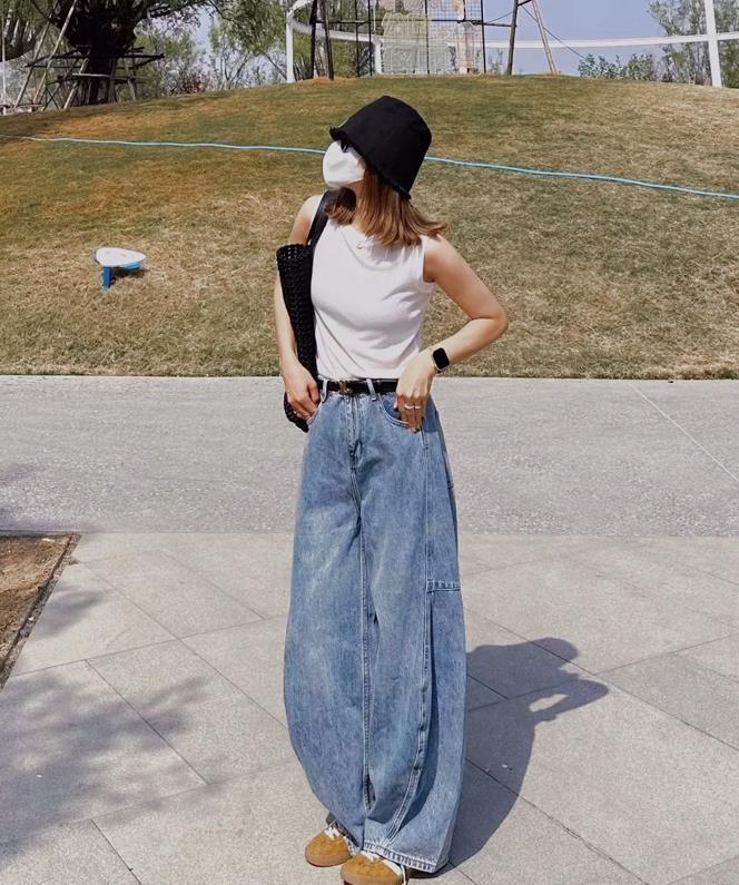 都是很簡約基礎的款式,白色無袖背心+牛仔闊腿褲,看似簡單的單品組合在一起,其實才更時髦出衆,輕輕鬆鬆就打造出高級感。記得要在腰間增加一條腰帶點綴,這樣才能對身材進行修飾,也顯瘦,佩戴起一條項鍊來點綴,實在是太精緻時髦了。