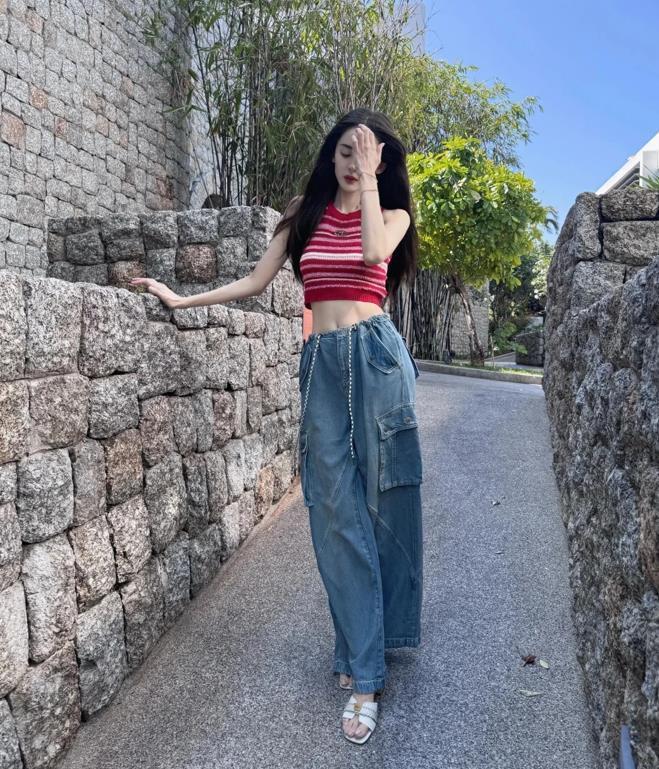 古力娜扎同款穿搭,大夏天的很值得姐妹們學習,紅色短款背心,輕鬆秀出你的馬甲線,還很清爽涼快,下身搭配一條牛仔闊腿褲,上窄下寬的組合,既不失性感又很休閒舒適,盡顯個人個性與潮流。