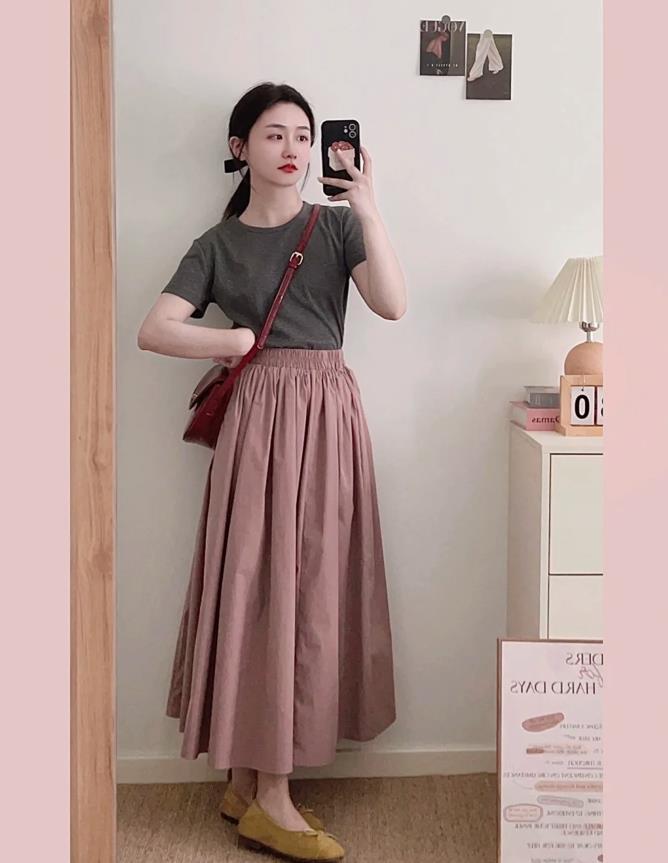 真的很喜歡這麼一條梅子色的裙子啊,看起來就很溫柔,在配色上,可以選擇白色、黑色或者是灰色這些基礎色來配,灰色+粉色的配色組合,也太好看了,還非常顯高級。