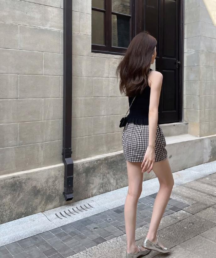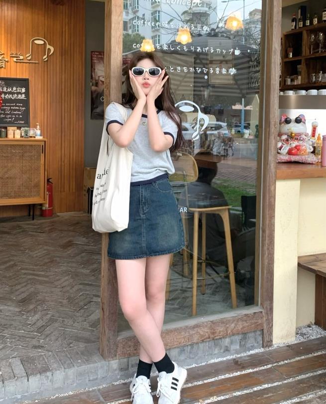 韓裏韓氣的一套,淺灰色針織短袖,相對一些亮色款的要低調很多,這個顏色沒有黑色那般沉悶,卻和黑色一樣的百搭不挑人。下身搭配起一條深藍色牛仔半裙,大夏天的就這麼露出雙腿來,很清爽涼快,小個子這麼穿也很顯高挑。