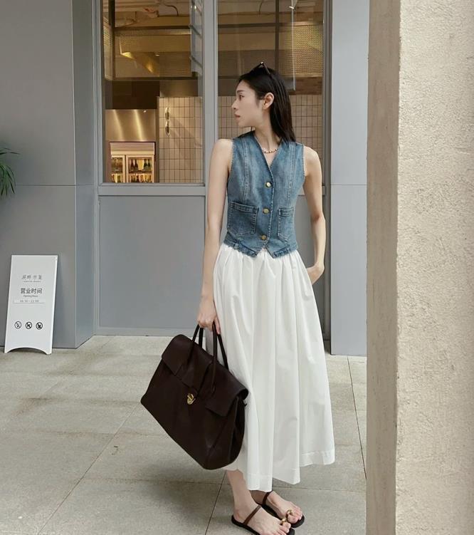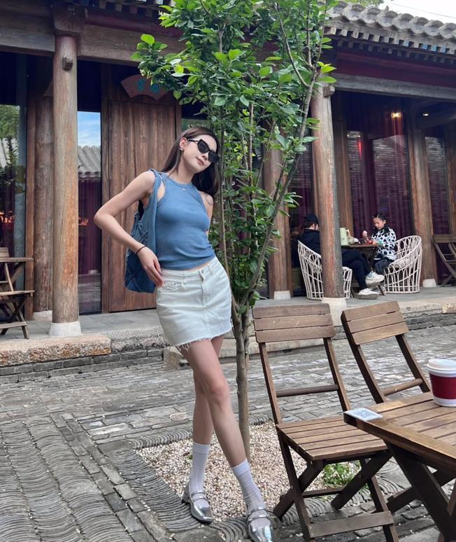 藍色和白色的配色組合,實在是太夏天了,無袖藍色背心,穿起來非常清爽涼快,與白色牛仔半身短裙相配,一整個清涼。選擇一雙銀色瑪麗珍單鞋,這麼一套看起來也太溫柔氣質了。
